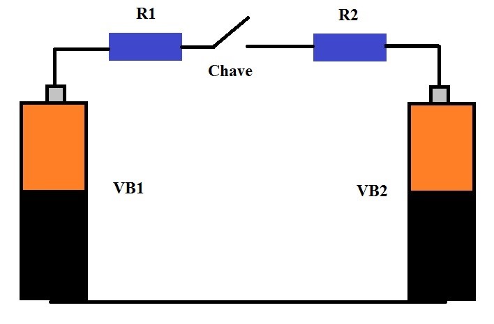 Vamos supor que as duas baterias tenham uma resistência interna de 10 m ? ou 0,01? (R1 e R2).