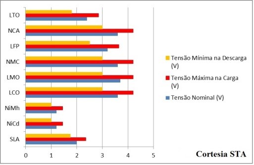 A figura a seguir compara as tensões dos sistemas à base de chumbo, níquel e lítio.